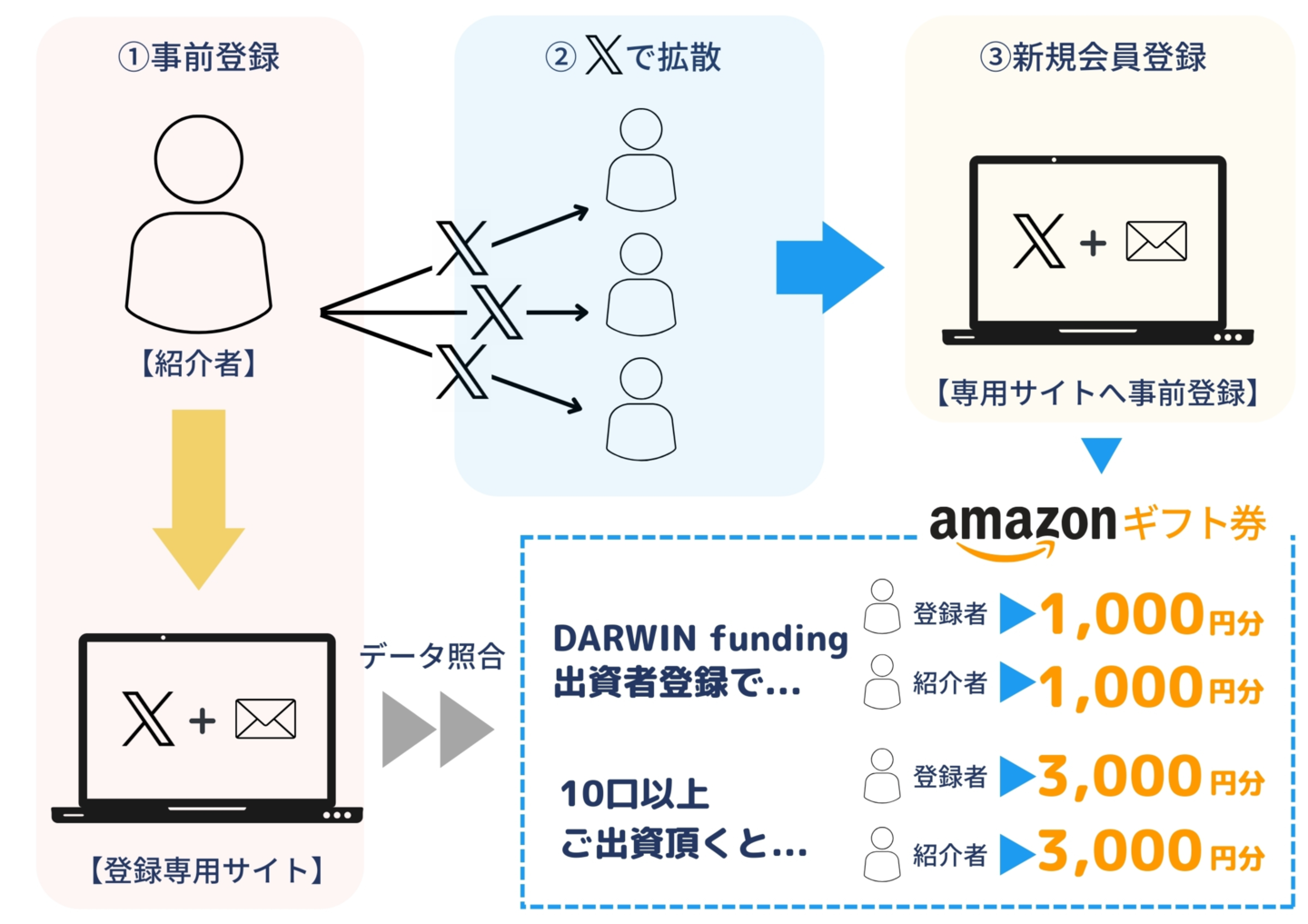 - ①ご紹介いただいた方がDARWIN fundingへ新規出資者登録を完了後、Amazonギフト券1,000円分の付与対象になります。